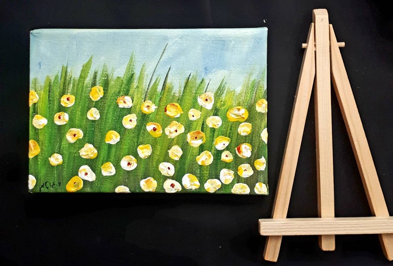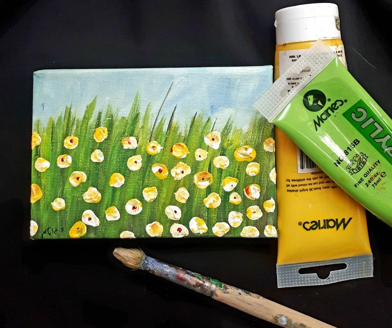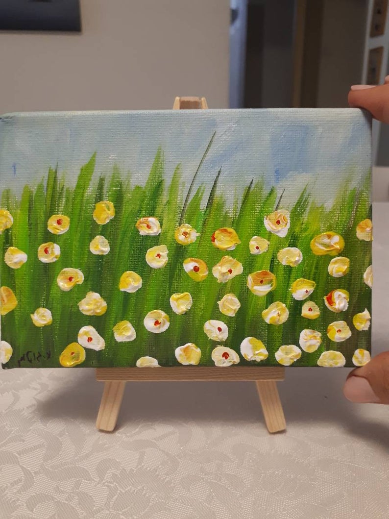 פרחים בצבעי צהוב לבן, מתאים כמתנה למשרד, למורה גננת חברה. ציור שמוסיף צבע ואופי לכל מדף.