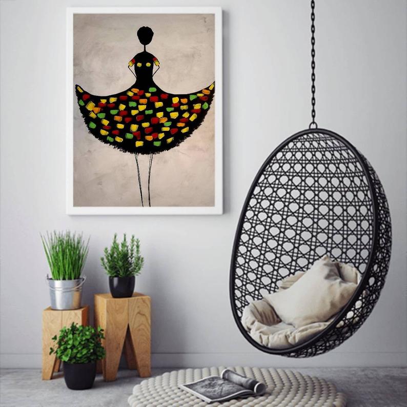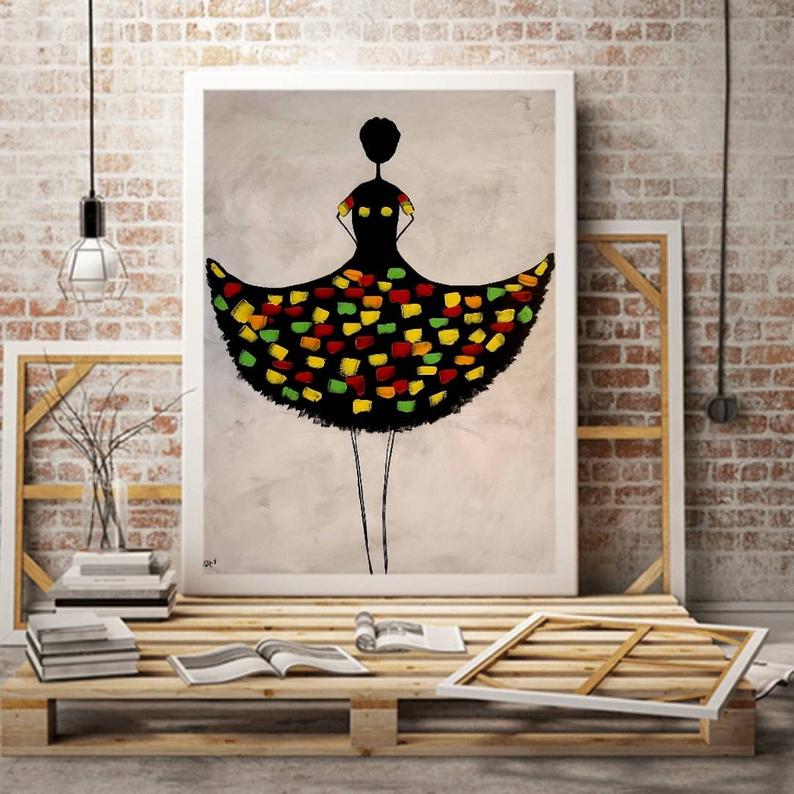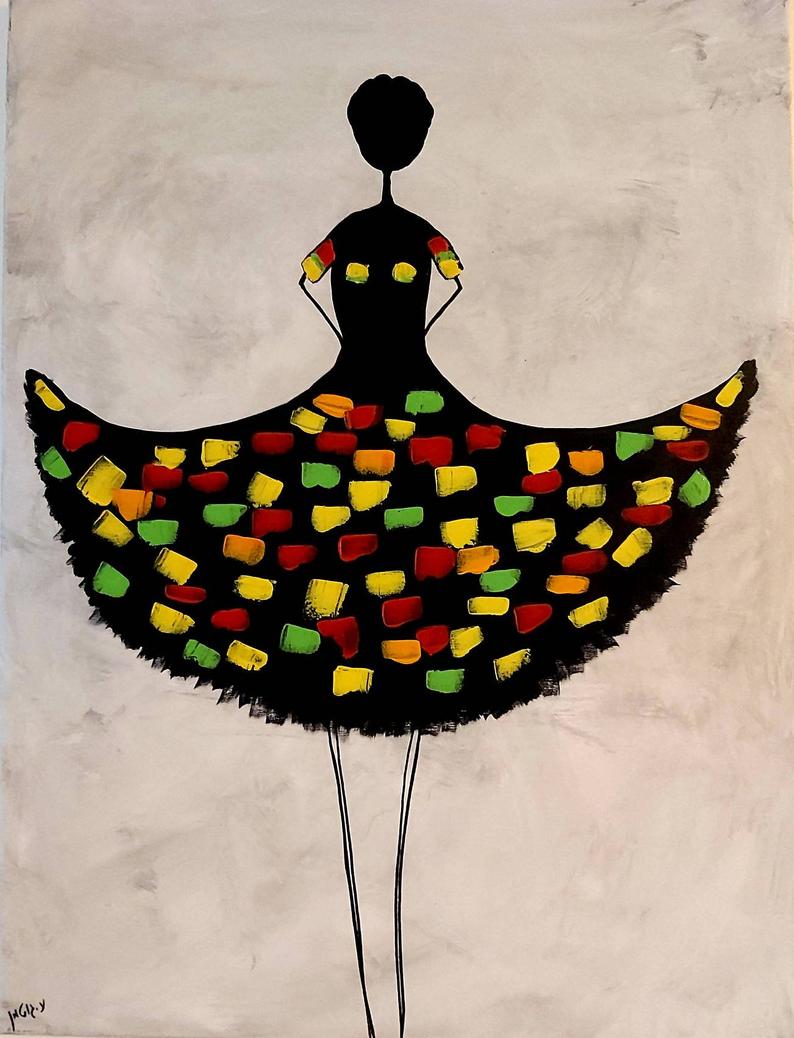 ציור בסגנון מופשט מודרני, רקדנית עם נגיעות שפכטל צבעוניות על רקע שחור. ציור בטכניקה מעורבת שמכניס הרבה אופי לכל חלל