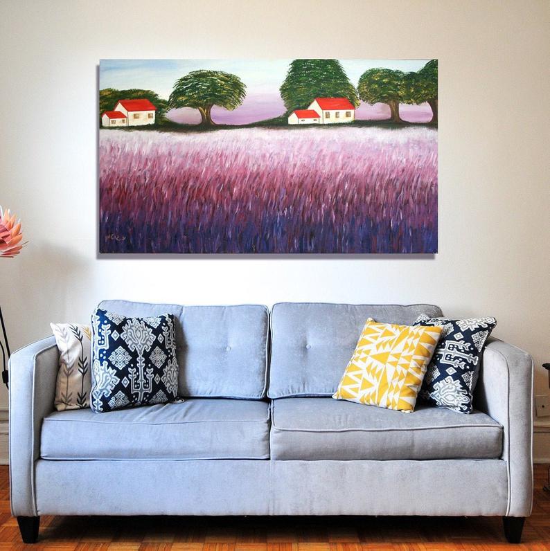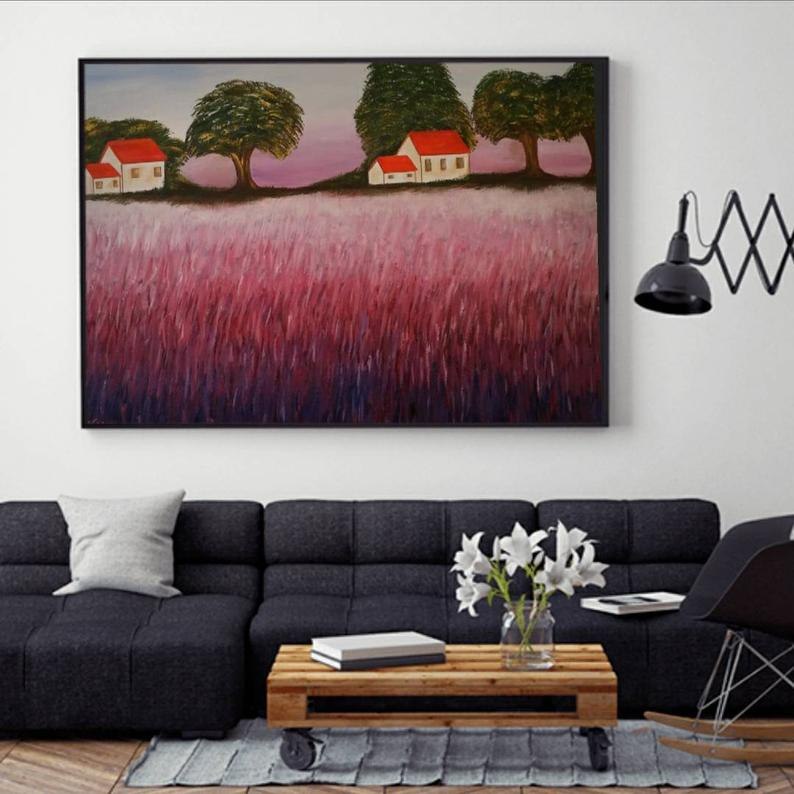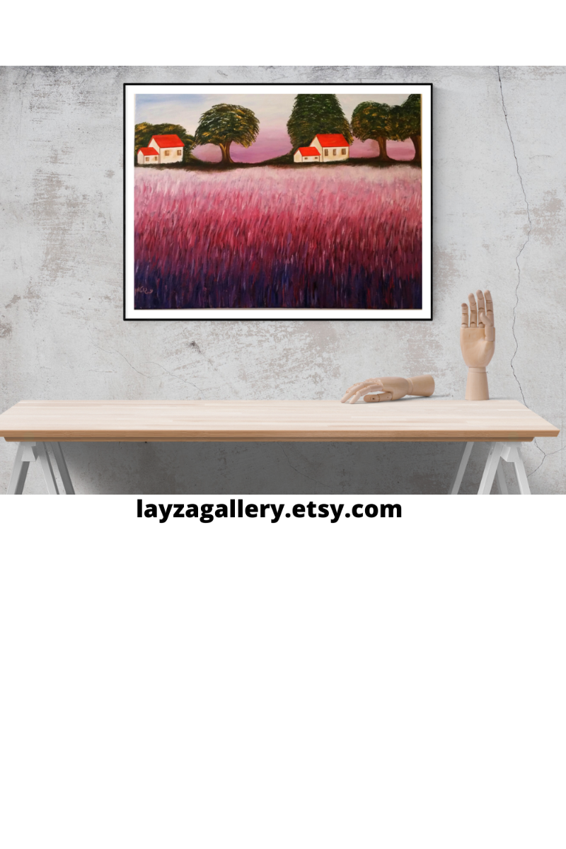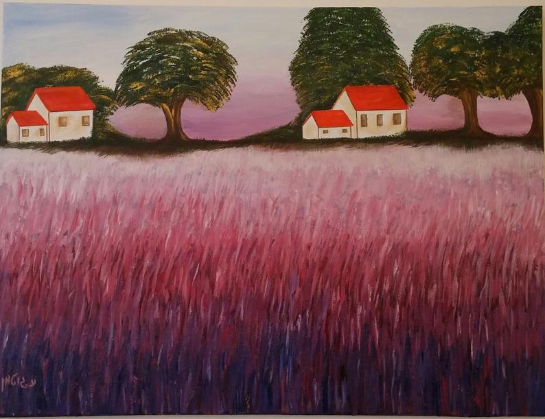 ציור מקורי של בתי כפר עם גג אדום ושדה בגוונים של סגול וורוד.